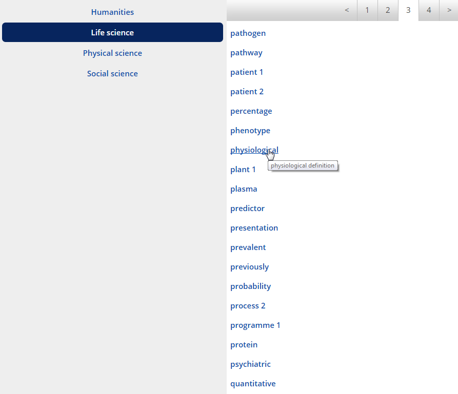 Four word lists contain words that are common in the academic fields of humanities, life science, physical science and social science.