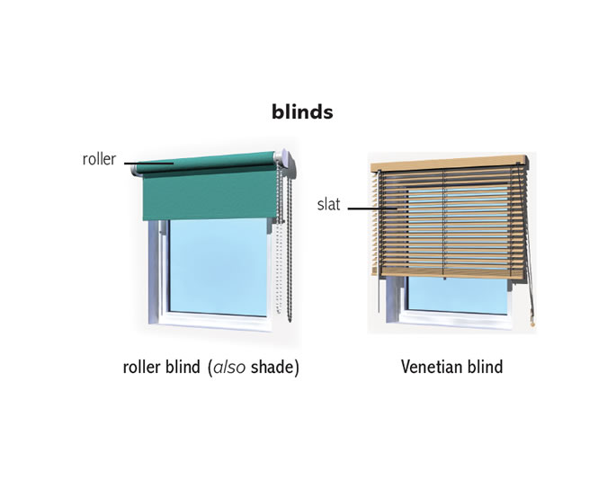 1(also shade, window shade) [countable] a covering for a window, especially one made of a roll of cloth that is fixed at the top of the window and can be pulled up and down see venetian blind